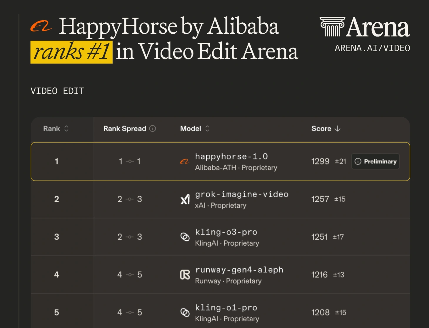 "New video model HappyHorse-1.0 by Alibaba-ATH debuts at #1 in Video Edit Arena.
