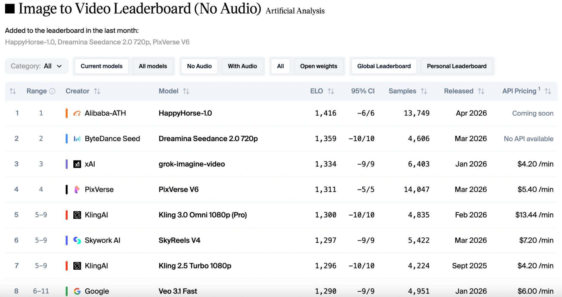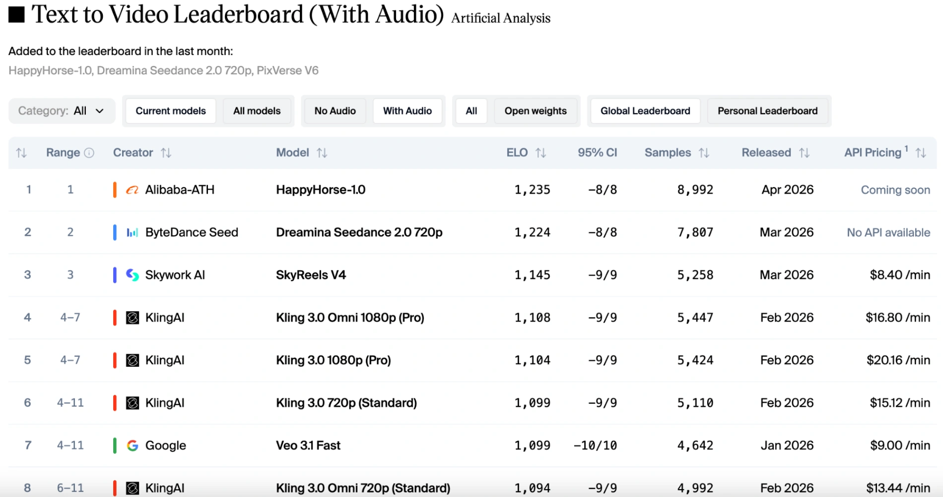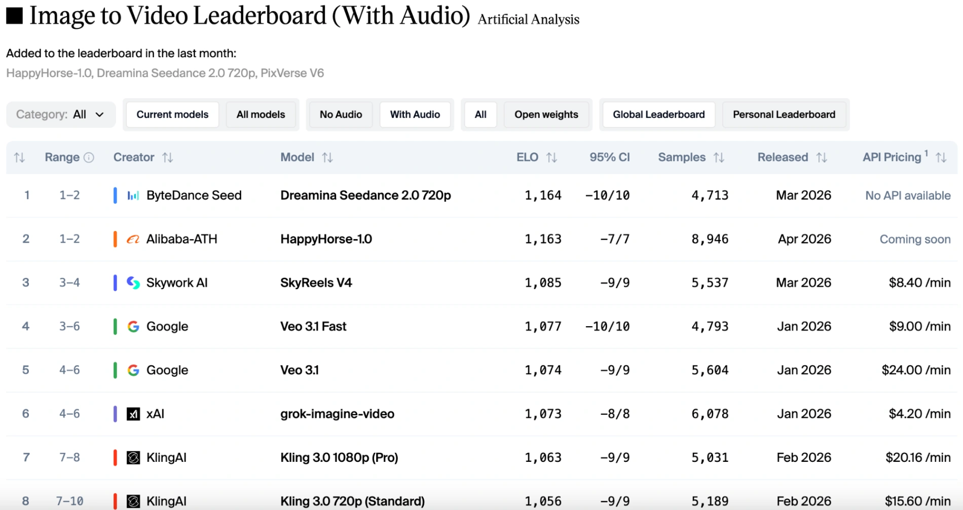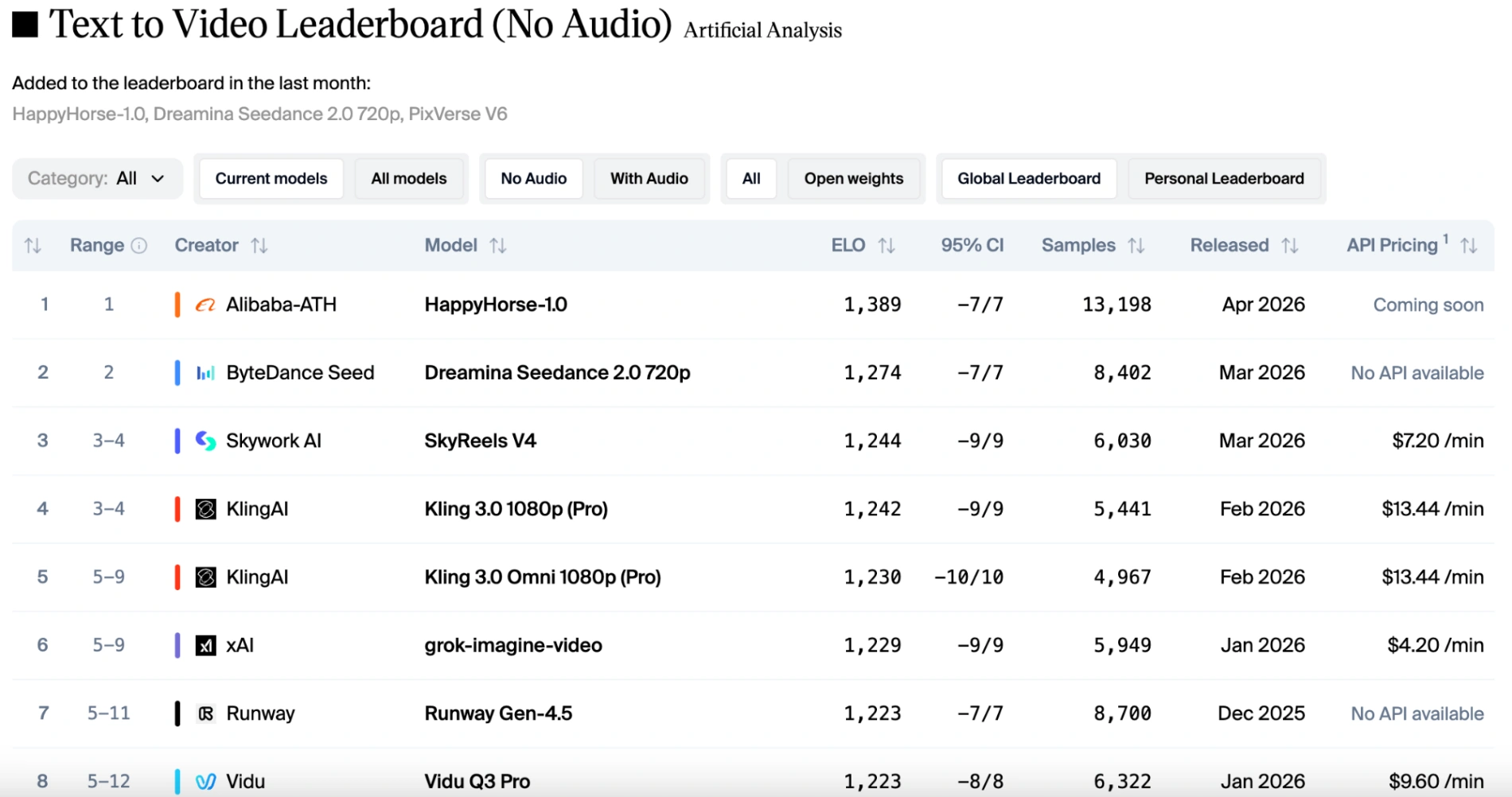 HappyHorse has landed in #1 or #2 across all of the leaderboards in the Artificial Analysis Video Arena. It comfortably takes first place in the “without audio” categories, while its Elo score in the “with audio” leaderboards is nearly identical to ByteDance's Dreamina Seedance 2.0. (Updated April 2026)